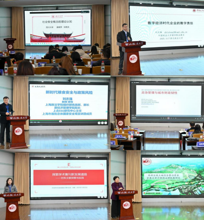 会议的主题报告阶段,分别由商学院(管理学院)院长李晓宁、副院长杨柳青主持。四川大学城市治理研究院院长姜晓萍教授作题为《社会安全概念的理论认知》主题报告;中国政法大学商学院副院长刘志雄教授作题为《数字经济时代企业的数字责任》主题报告;上海政法学院党委常委刘志强教授作题为《新时代粮食安全与政策风险》主题报告;浙江大学公共管理学院院长赵志荣教授作题为《城市财政韧性和地方债务管理》主题报告;社会科学文献出版社刘扬编辑作题为《探索学术集刊新发展道路》主题报告;西北政法大学赵杭莉教授作题为《西部全域土地综合整治资金穿透式审计协同治理机制研究》主题报告。