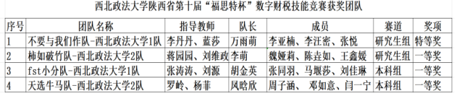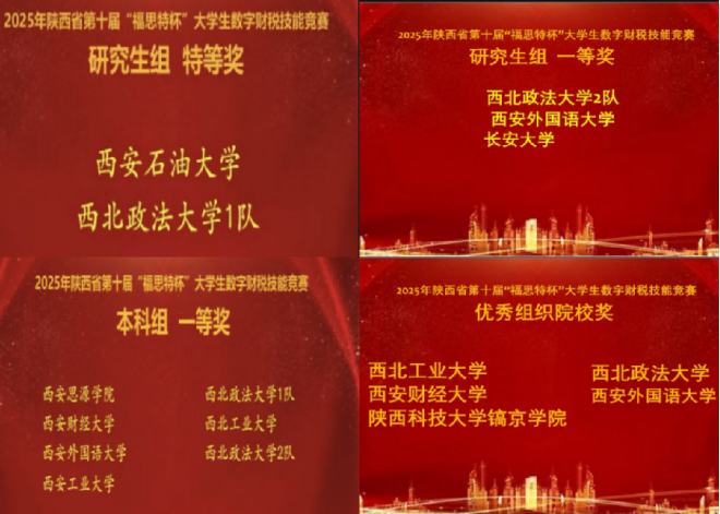 2025年11月8日,由陕西省高等学校教学指导委员会工商管理类工作委员会主办、西北政法大学承办的陕西省第十届“福思特杯”大学生数字财税技能竞赛圆满落幕。本届竞赛吸引了来自全省36所高校的51支队伍同台竞技。经过激烈角逐,西北政法大学商学院代表队凭借扎实的专业功底和出色的团队协作能力,斩获研究生组特等奖1项、研究生组一等奖1项、本科组一等奖2项,我校同时荣获“优秀组织院校奖”。